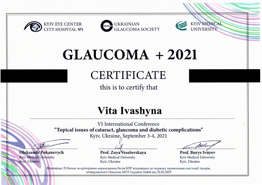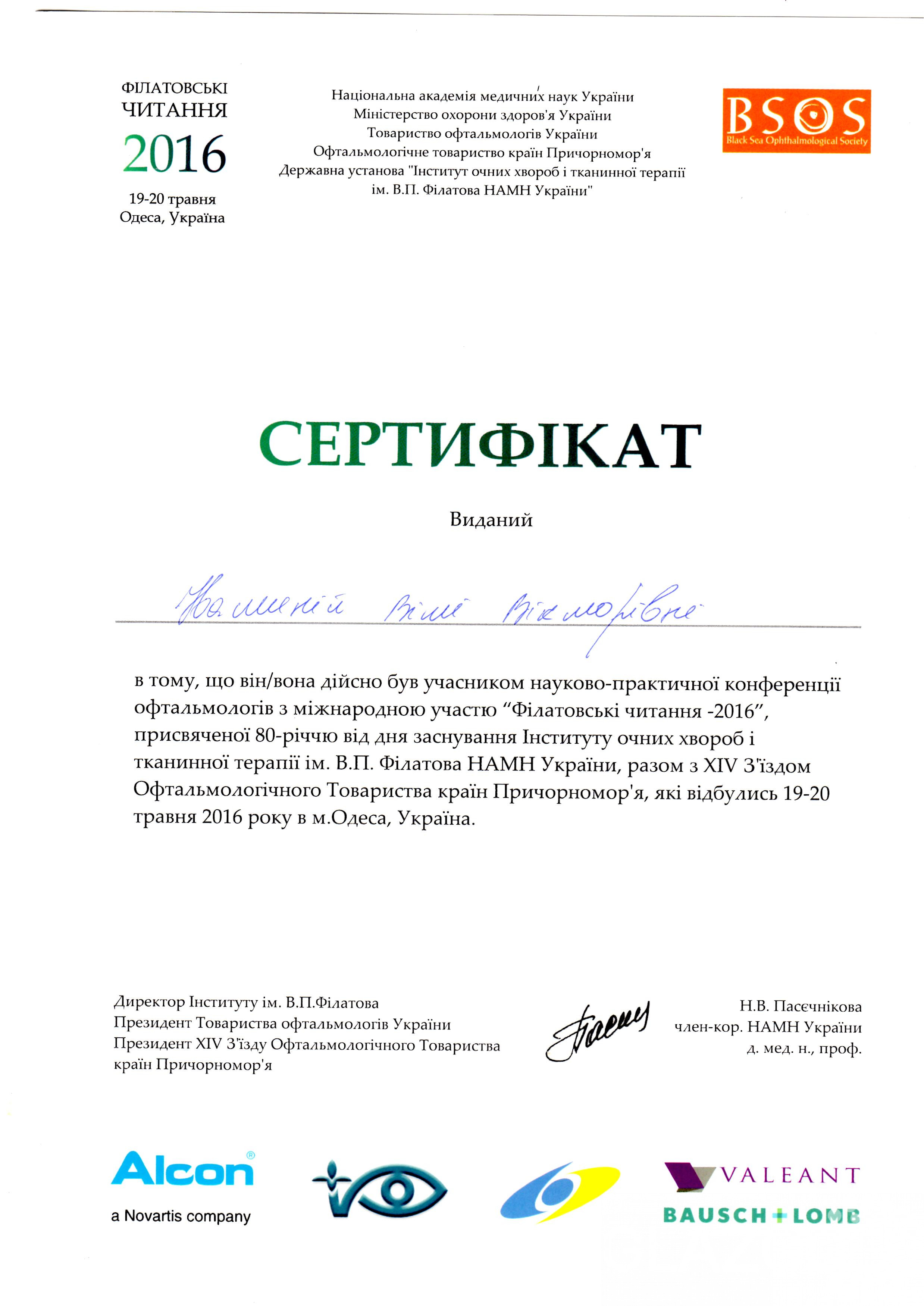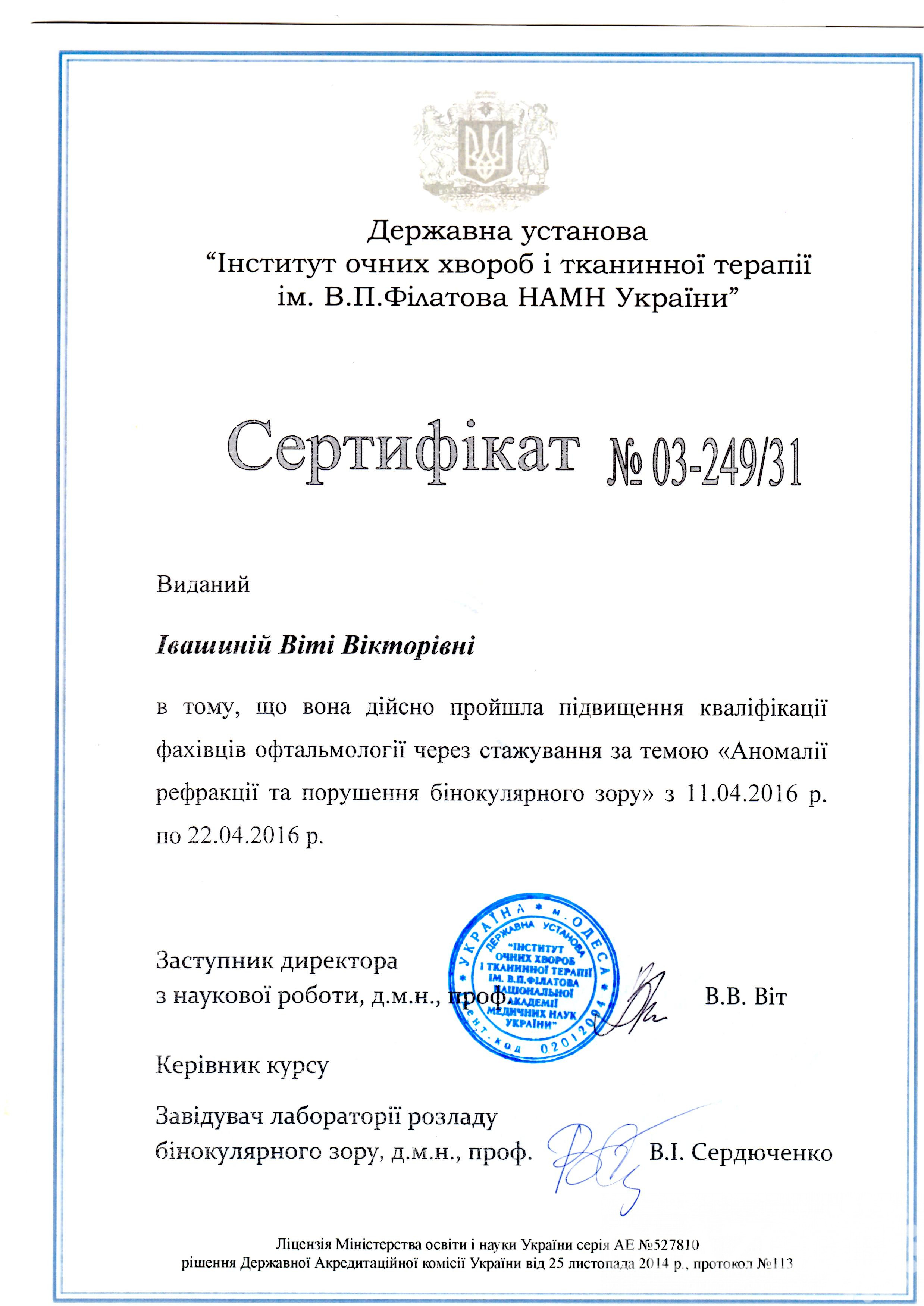 С 11.04.2016 г по 22.04.2016 г – курсы повышения квалификации в «Институте глазных болезней и тканевой терапии им. В.П. Филатова АМН Украины» по теме: «Аномалии рефракции и нарушение бинокулярного зрения».