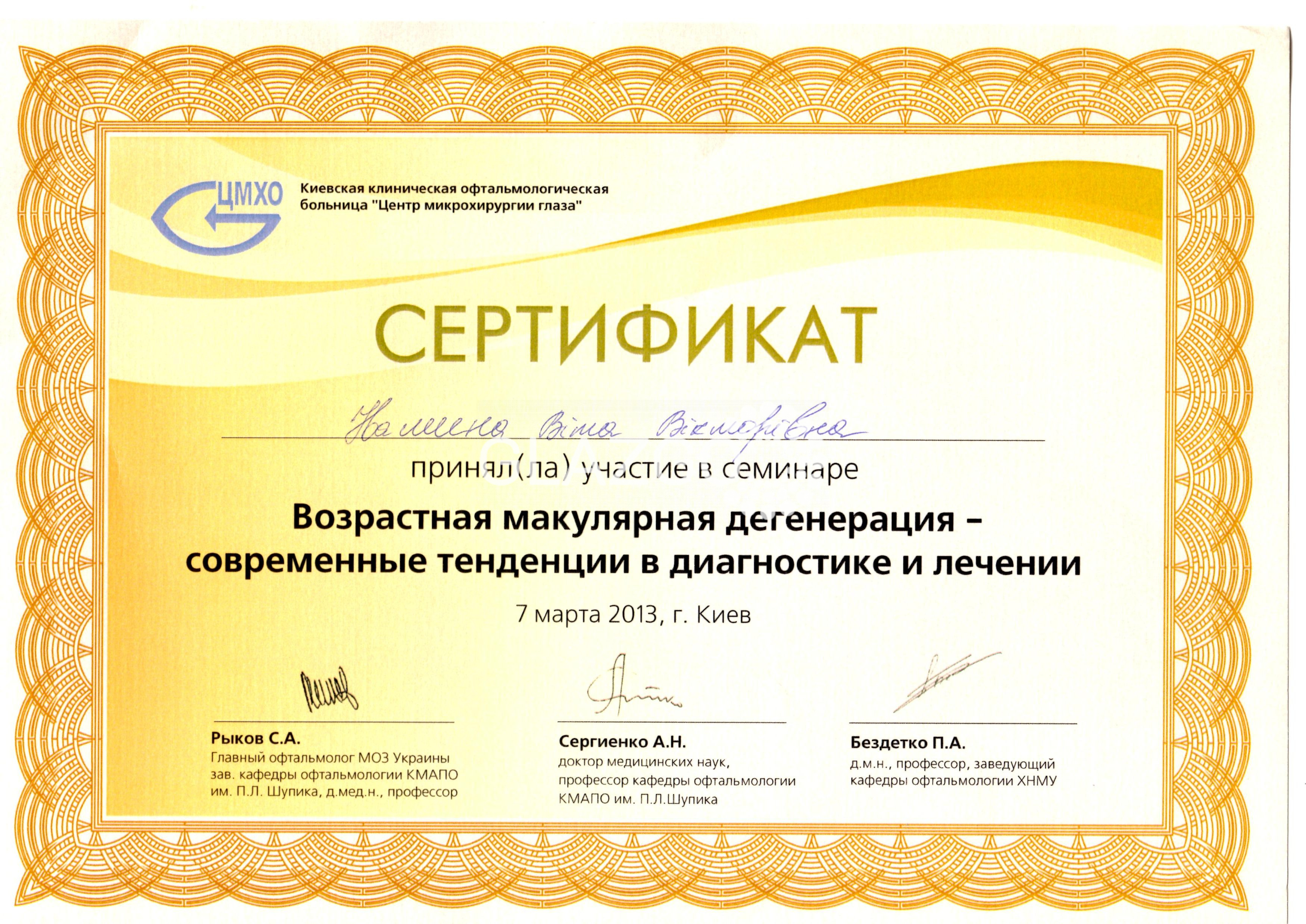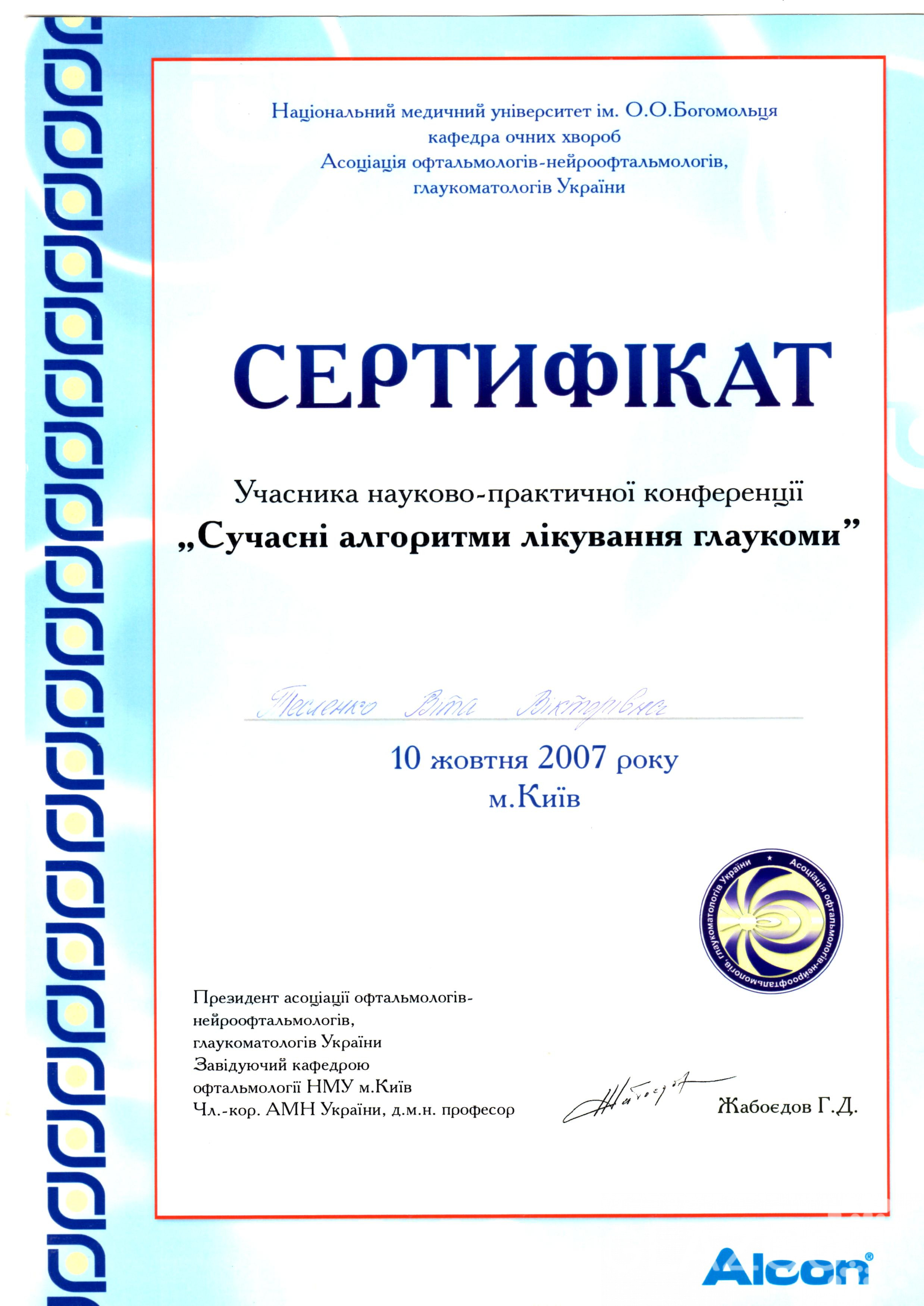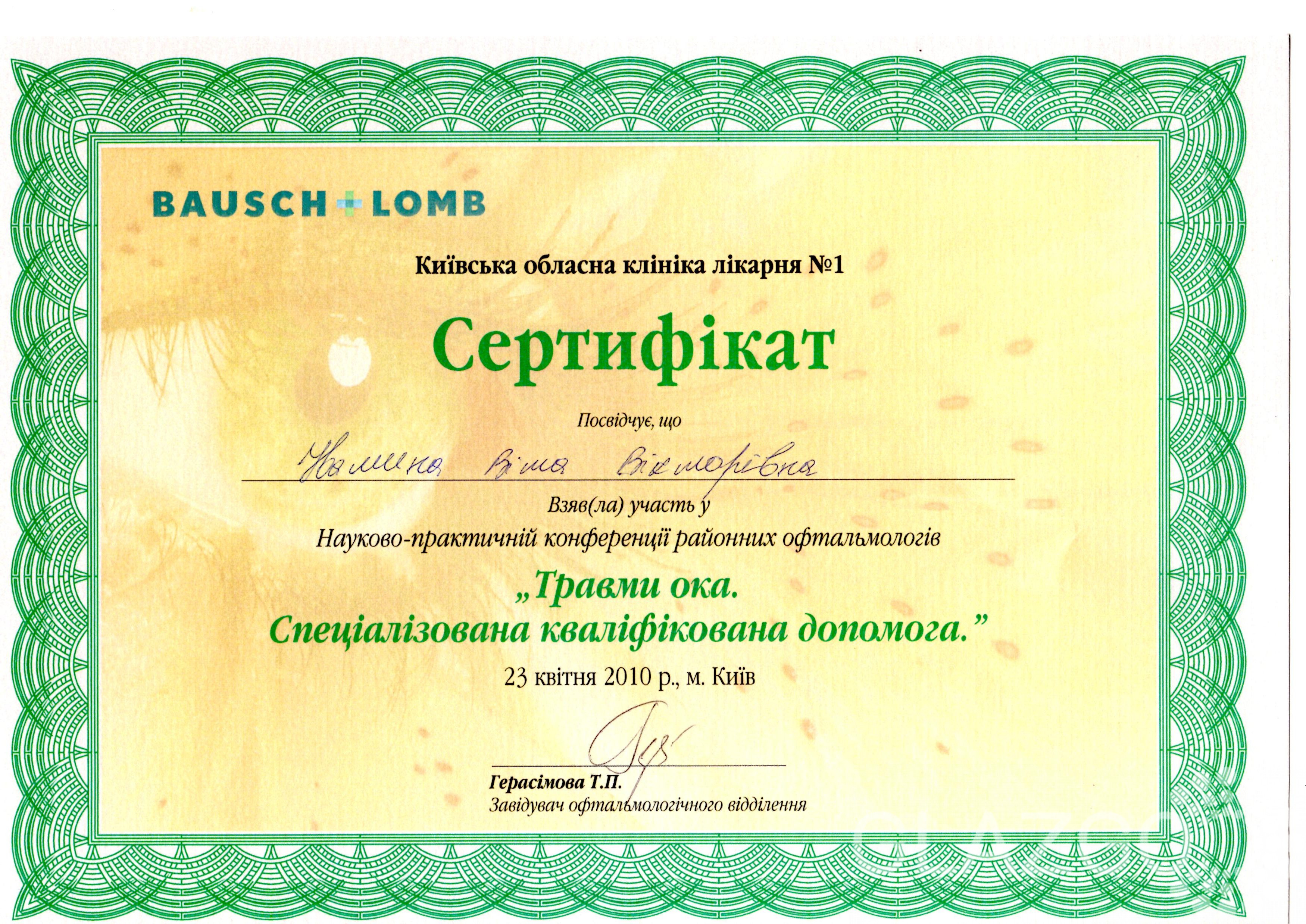 С 11.04.2016 г по 22.04.2016 г – курсы повышения квалификации в «Институте глазных болезней и тканевой терапии им. В.П. Филатова АМН Украины» по теме: «Аномалии рефракции и нарушение бинокулярного зрения».